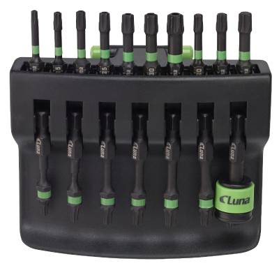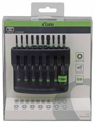 17 delars bitssats i Luna GO verktygshållarsystem. Verktygshållaren har plats för tio toppmonterade och sju hängande verktyg i ett unikt upphängningssystem med magnetlåsning. För en snabb smidig hantering och bra förvaring av verktyg med 1/4''-sexkantsfäste. Verktygshållaren är ledad och kan enkelt monteras i Luna GO bältesclips 24615-0106. Satsen består av Impact bits lämpliga för slagskruvdragare.